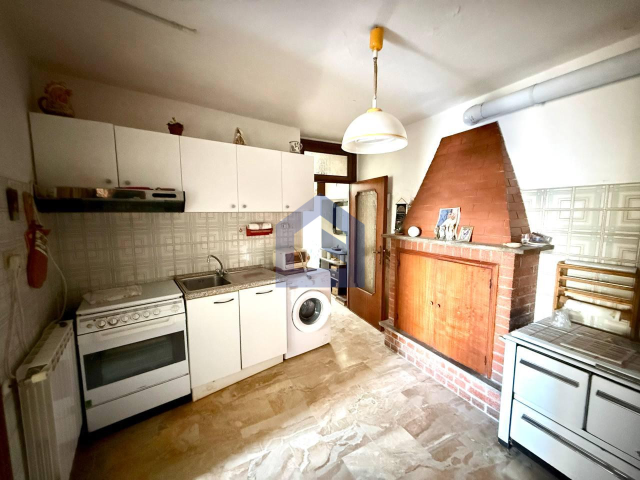 Proseguendo si accede a una grande cucina abitabile con camino e stufa a legna antica.